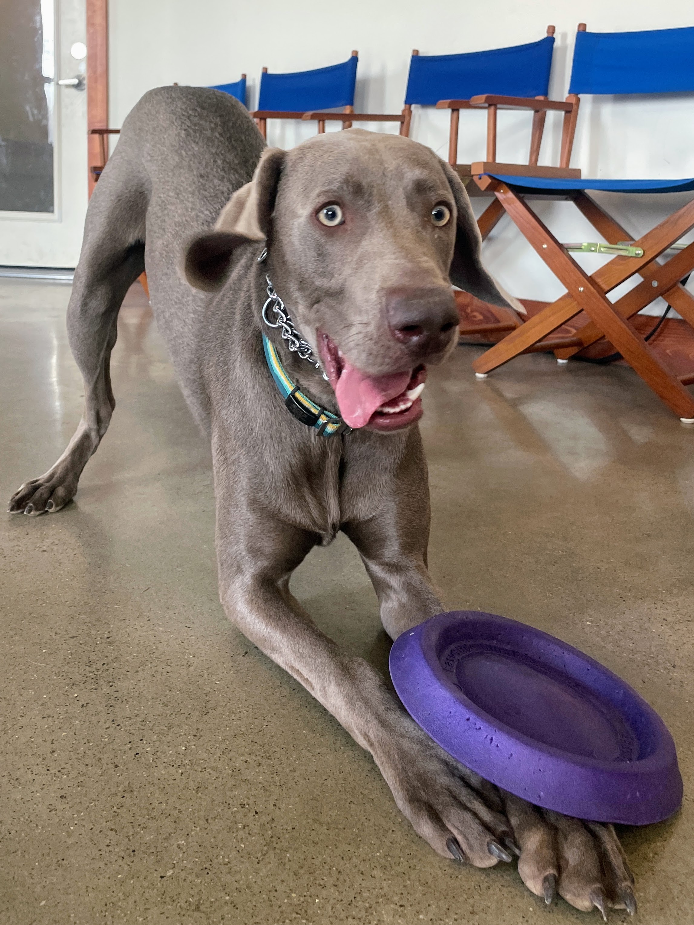 dog_play_9 Published March 26, 2025 at 2294 × 3059 in Training the Unique Canine Personality Next → Play is an important part of each dogs training day at Kabler! Weimeraner playing with frisbee.